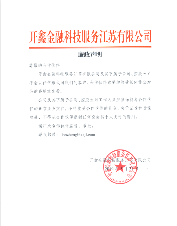 开鑫金融科技服务江苏有限公司致力于打造公开、透明、开放的商业合作环境,为了在合作过程中保持廉政自律的工作氛围,防止各种不正当行为的发生,请广大合作伙伴监督、举报。