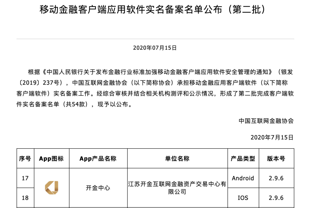 7月15日,中国互联网金融协会(下称“中国互金协会”)公布第二批《移动金融客户端应用软件实名备案名单》(下称“第二批名单”),开金中心App成功入选,顺利完成了备案。