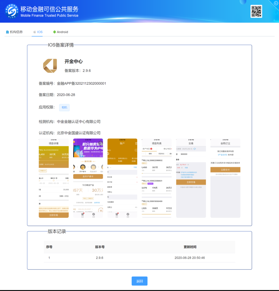 经过中国互金协会的综合审核,开金中心App于7月15日正式完成移动金融应用客户端备案认证。