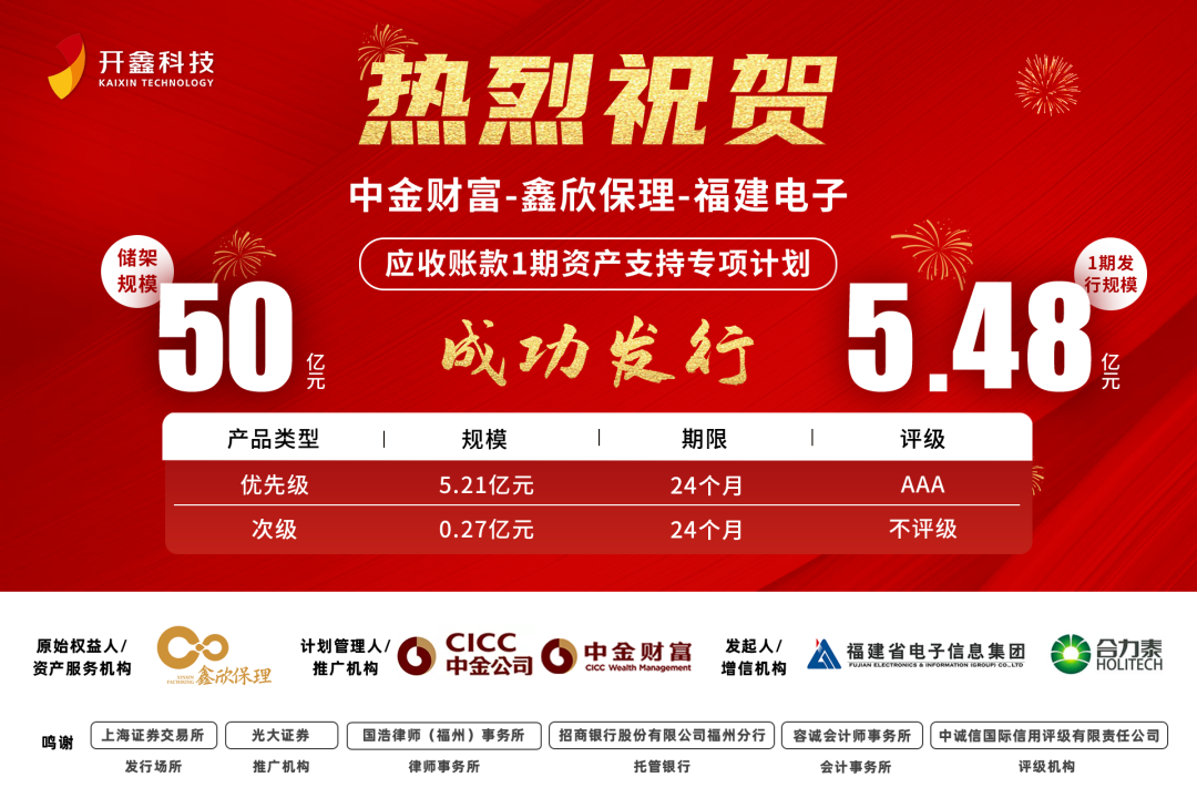 10月27日,中金财富-鑫欣保理-福建电子应收账款资产支持专项计划成功发行,储架规模50亿元,首期发行规模5.48亿元,期限2年,产品评级AAA。