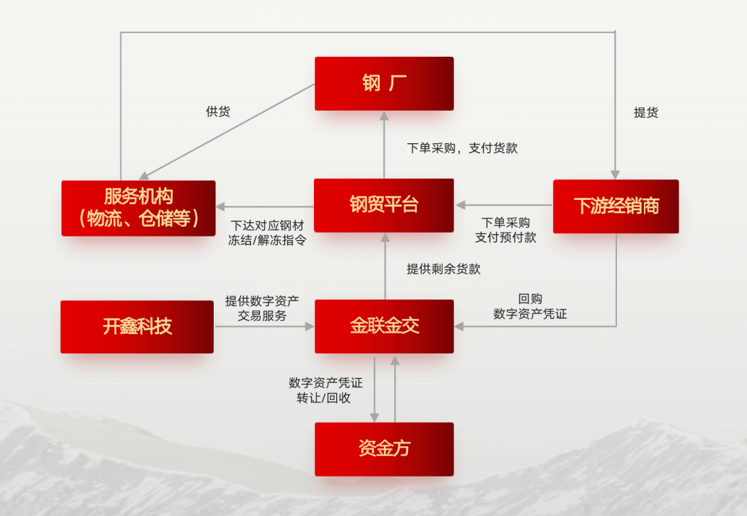 金联金交深入钢铁贸易供应链场景,在钢铁采购流程中发挥数字资产交易凭证作用。通过钢贸平台,下游经销商向钢铁采购方支付预付款,钢铁采购方将预付款支付至钢厂,钢铁采购方与钢厂签署合同约定到期供货,钢厂收到预付款后开始排期生产。此时,金联金交基于预付款和提货权生成数字资产凭证。