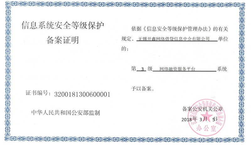 | 计算机信息安全等级保护三级 | 开鑫贷信息系统安全登记保护备案证明 |