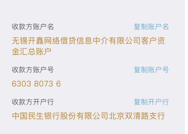 返回开鑫贷APP首页,依次点击屏幕右下角“我的”→“充值”→“转账充值”,使用绑定银行卡,通过该银行的网上银行或手机银行将资金转至下图显示的指定收款方账户,完成充值。